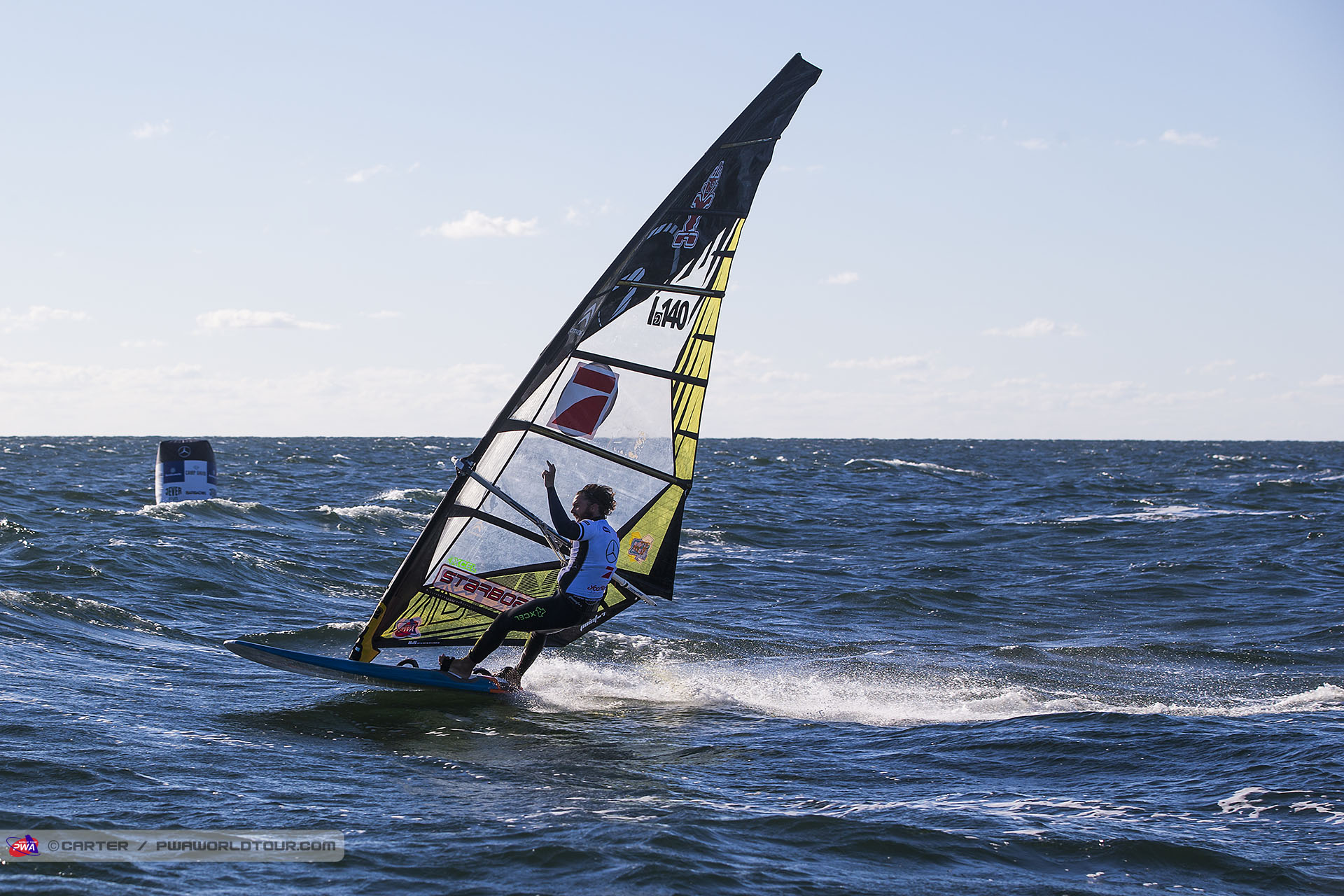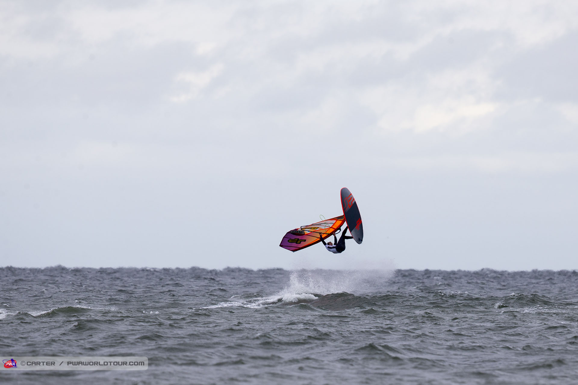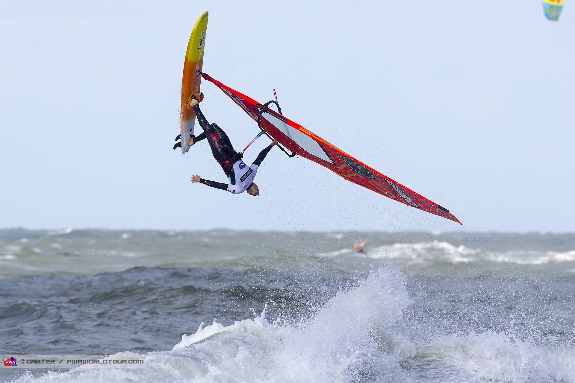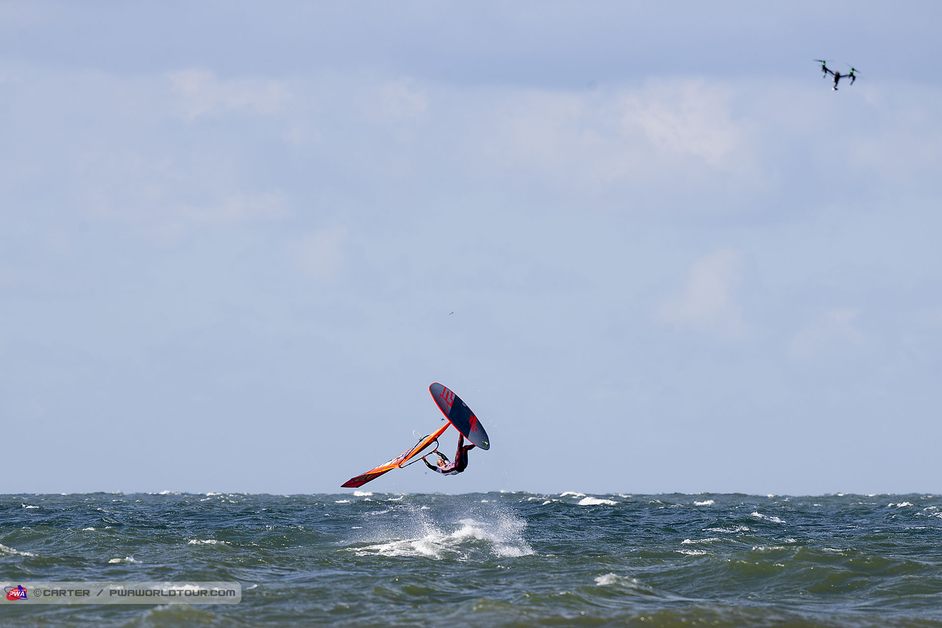 However, Vrieswijk, will face a stern challenge with 6-time PWA Freestyle World Champion — Jose ‘Gollito’ Estredo (Fanatic / NorthSails / MFC) — just one place behind him. Gollito will take hope that he can secure a 7th world title given that he stole an unlikely victory here in 2014 when he only had outside hopes and things are set for a blockbuster finale with a promising looking forecast and not much separating the top two.